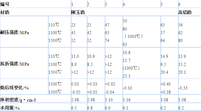 剛玉和高鋁質自流耐火澆注料的組成:中粒則用近似球形的板狀剛玉,電熔白剛玉作細骨粉和細粉,添加α- Al2O3 和SiO2 超微粉,用CA-80水泥作結合劑并分別加三聚磷酸鈉、六偏磷酸鈉和有機減水劑;編號4采用白剛玉作骨粉料,用不同*工藝的α- Al2O3 超微粉作粉料,CA-70水泥作結合劑并加減水劑;編號5采用Al2O3 ≥99.5%的電熔剛玉和板狀剛玉作耐火骨料和粉料,添加α- Al2O3 超微粉,用CA-80水泥作結合劑并加無機減水劑;編號6采用Al2O3 ≥85%的礬土熟料作耐火骨料和粉料,同時添加α- Al2O3 和SiO2 超微粉,用CA-70水泥作結合劑并加減水劑。