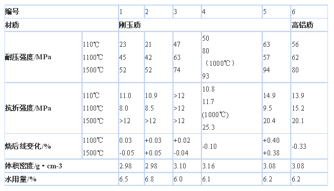 剛玉和高鋁質自流耐火澆注料的性能,見下表。編號1~3采用致密剛玉作粗骨料,中粒則用近似球形的板狀剛玉,電熔白剛玉作細骨粉和細粉,添加α- Al2O3 和SiO2 超微粉,用CA-80水泥作結合劑并分別加三聚磷酸鈉、六偏磷酸鈉和有機減水劑;編號4采用白剛玉作骨粉料,用不同*工藝的α- Al2O3 超微粉作粉料,CA-70水泥作結合劑并加減水劑;編號5采用Al2O3 ≥99.5%的電熔剛玉和板狀剛玉作耐火骨料和粉料,添加α- Al2O3 超微粉,用CA-80水泥作結合劑并加無機減水劑;編號6采用Al2O3 ≥85%的礬土熟料作耐火骨料和粉料,同時添加α- Al2O3 和SiO2 超微粉,用CA-70水泥作結合劑并加減水劑。