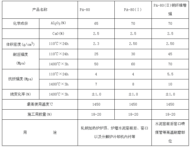 PA-80耐高溫澆注料是用PA-80耐高溫膠粘劑與組合耐火粉、高鋁骨料、固化劑等配制成的。具有耐高溫、強度高、熱穩定性好等特點,使用溫度比普通澆注料高300℃左右。主要用于加熱爐、均熱爐的爐墻、爐頂、燒嘴等部位的整體澆注或局部修補。本公司還專門設立澆注預制車間,根據用戶需要,按圖制作各種預制構件,并經800℃烘烤,以利于用戶縮短烘爐時間。