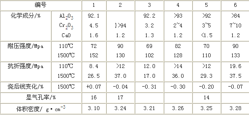下表為鉻剛玉質(zhì)耐火澆注料的性能。表中編號1用板狀剛玉作耐火骨料,電熔白剛玉作粉料。編號2用致密剛玉作耐火骨料和粉料。其余的用電熔白剛玉作耐火骨料和粉料。耐火骨料臨界粒徑為10mm或8mm,總用量為70%;同時還采用a-Al2O3超微粉、工業(yè)氧化鉻和很 少量的mf- SiO2作耐火粉料。編號5用CA-80水泥作結(jié)合劑,其余的結(jié)合劑為CA-70水泥。同時摻加減水劑和緩凝劑等。從表中看出,Al2O3和Cr2O3合量大于94%料的純度很高。體積密度大于3.10 g·cm-3,料較致密。110℃烘干和1500℃燒后耐壓強(qiáng)度分別大于68Mpa和102Mpa,1500℃燒后線變化除編號1外均呈負(fù)值,即略有收縮。總之,高純度鉻剛玉質(zhì)耐火澆注料的性能是優(yōu)良的。